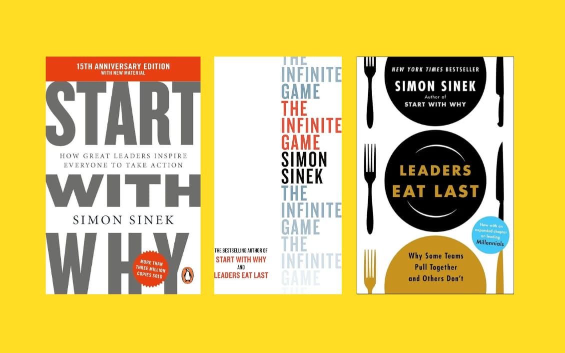three books by author Simon Sinek: Start with Why, The Infinite Game, and Leaders Eat Last.